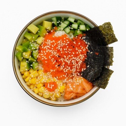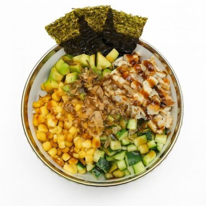 рис, огурцы, курица, авокадо, нори, кукуруза, сырный соус, лист салата