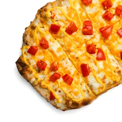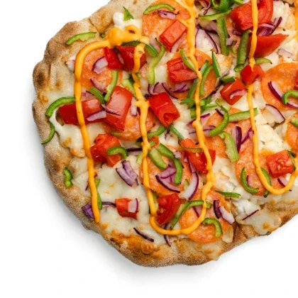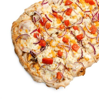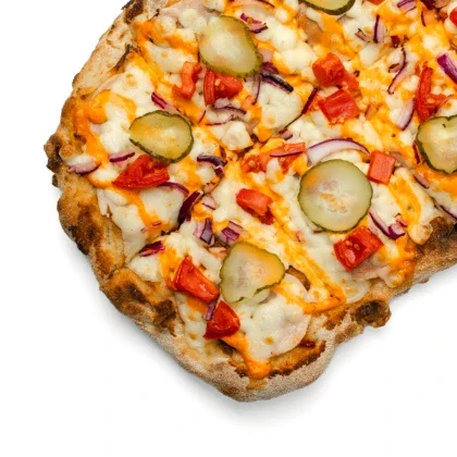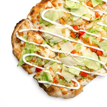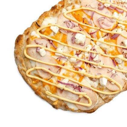 Соус Ранч с добавлением чеснока, куриная ветчина, двойная порция филе цыплёнка, моцарелла и спелые томаты.